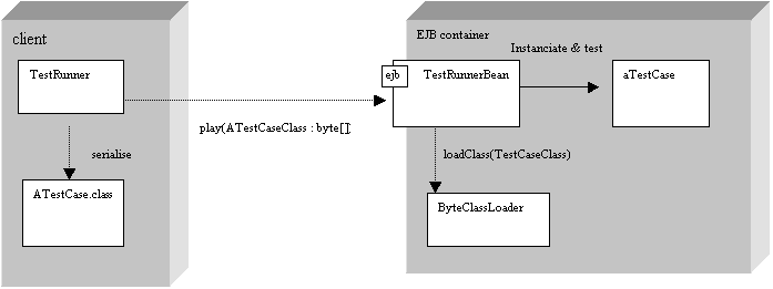 The first simple idea is to use a server side Stateless Session EJB. A client call will tell it which TestCase it must execute on the server.